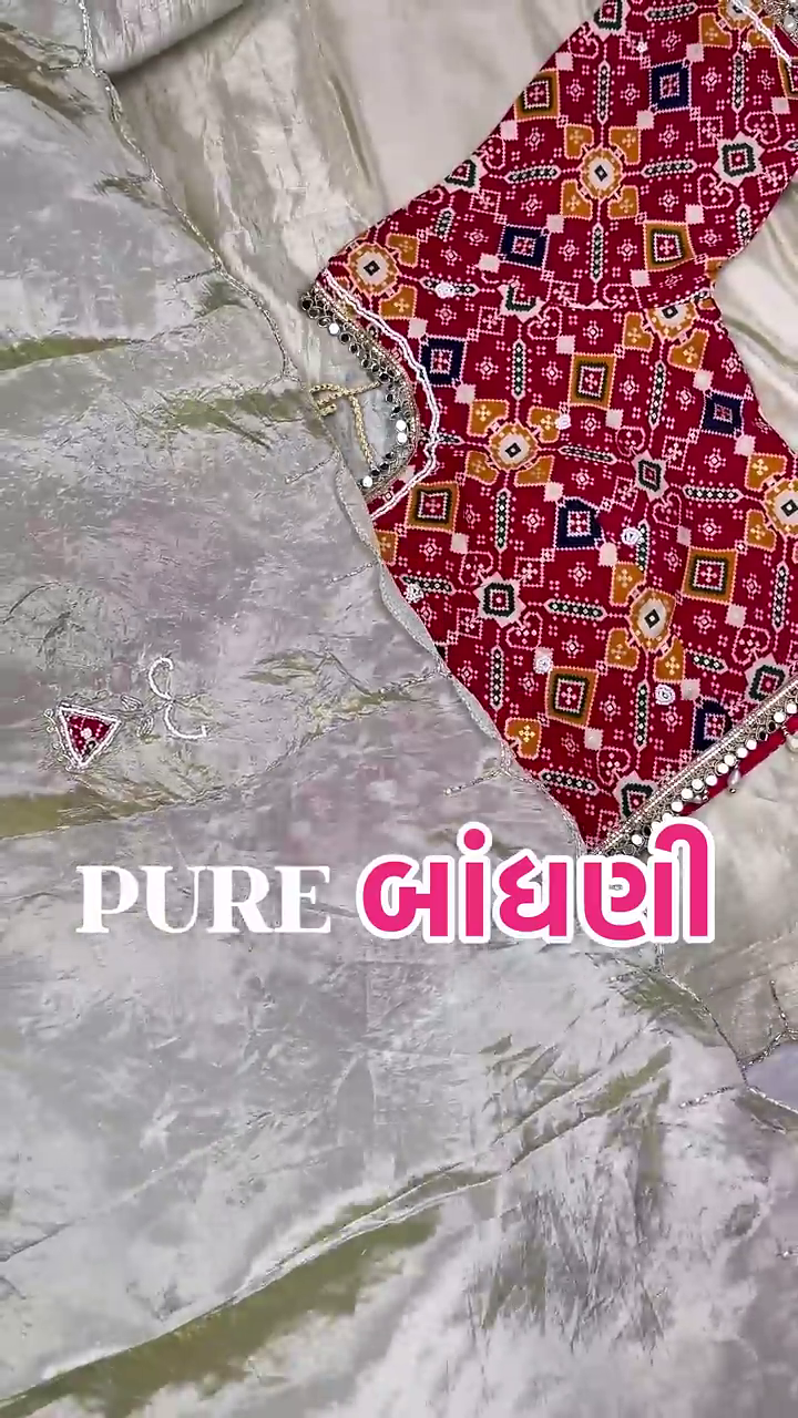 | Work Type | Geometric Patola Printing • Pearl-Droplet Borders • Golden Zari |