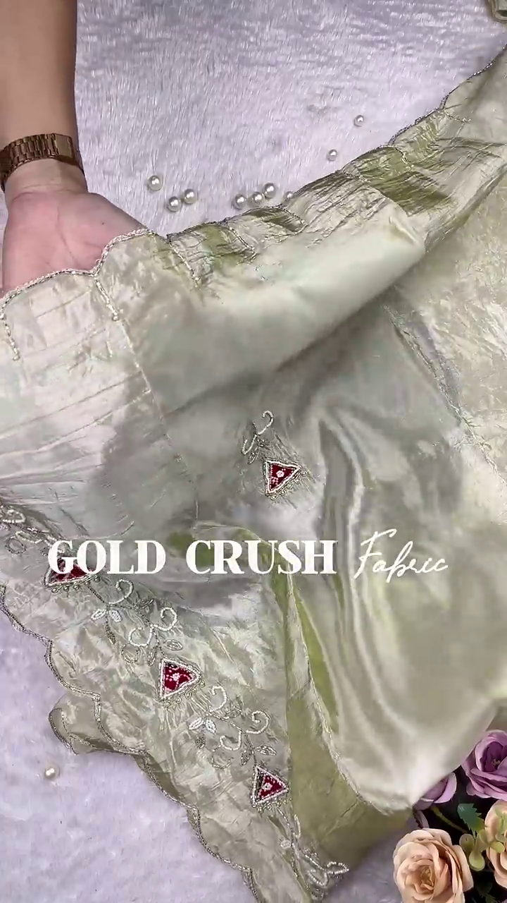 ✔️ Hand-Finished Detailing: Close-up views highlight the precision of the pearl-beaded trim and the metallic golden borders.