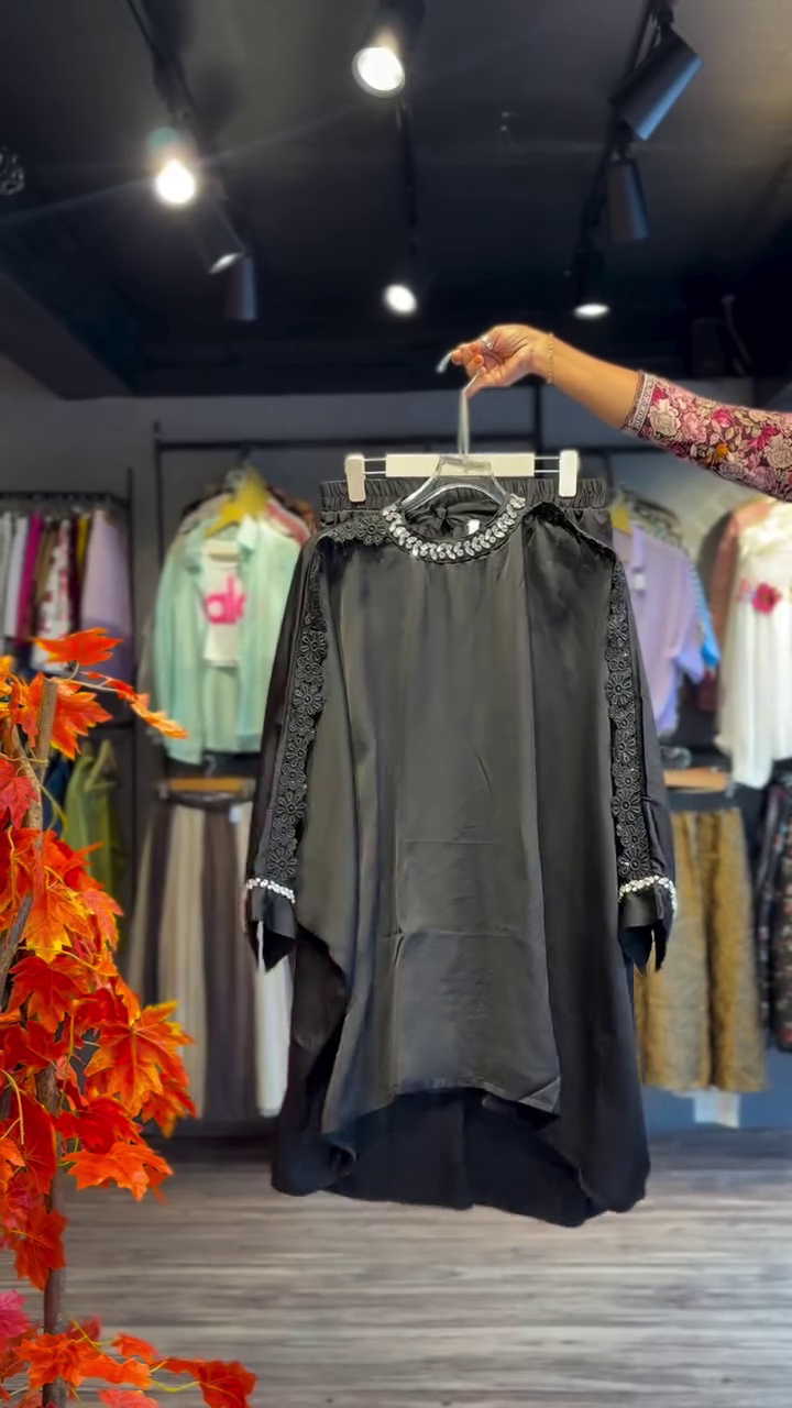 This stylish Co-Ord Set features a beautifully embroidered organza top paired with a soft, flowy skirt.