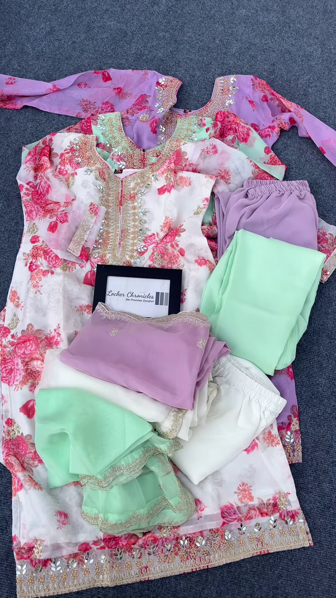 The kurti is crafted in a soothing lavender base, beautifully contrasted by bold floral prints in shades of pink, red, and peach. These rose-inspired blooms are scattered thoughtfully across the fabric, giving it a refreshing and romantic look. The highlight of the garment is the heavily embroidered neckline, adorned with golden zari work, mirror accents, and delicate leaf motifs. The embroidery is concentrated at the yoke, extending down in a vertical line to elongate the upper body and create a flattering effect.