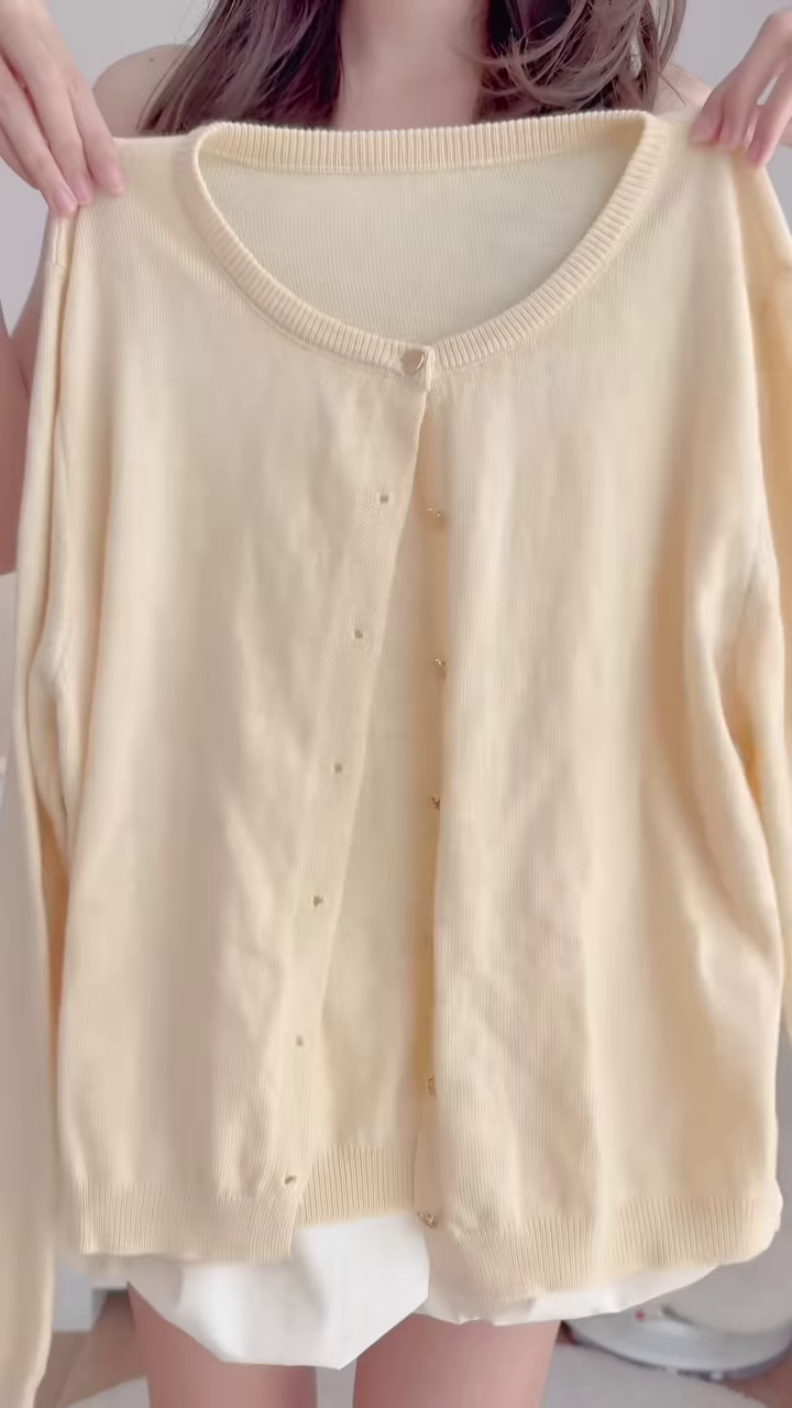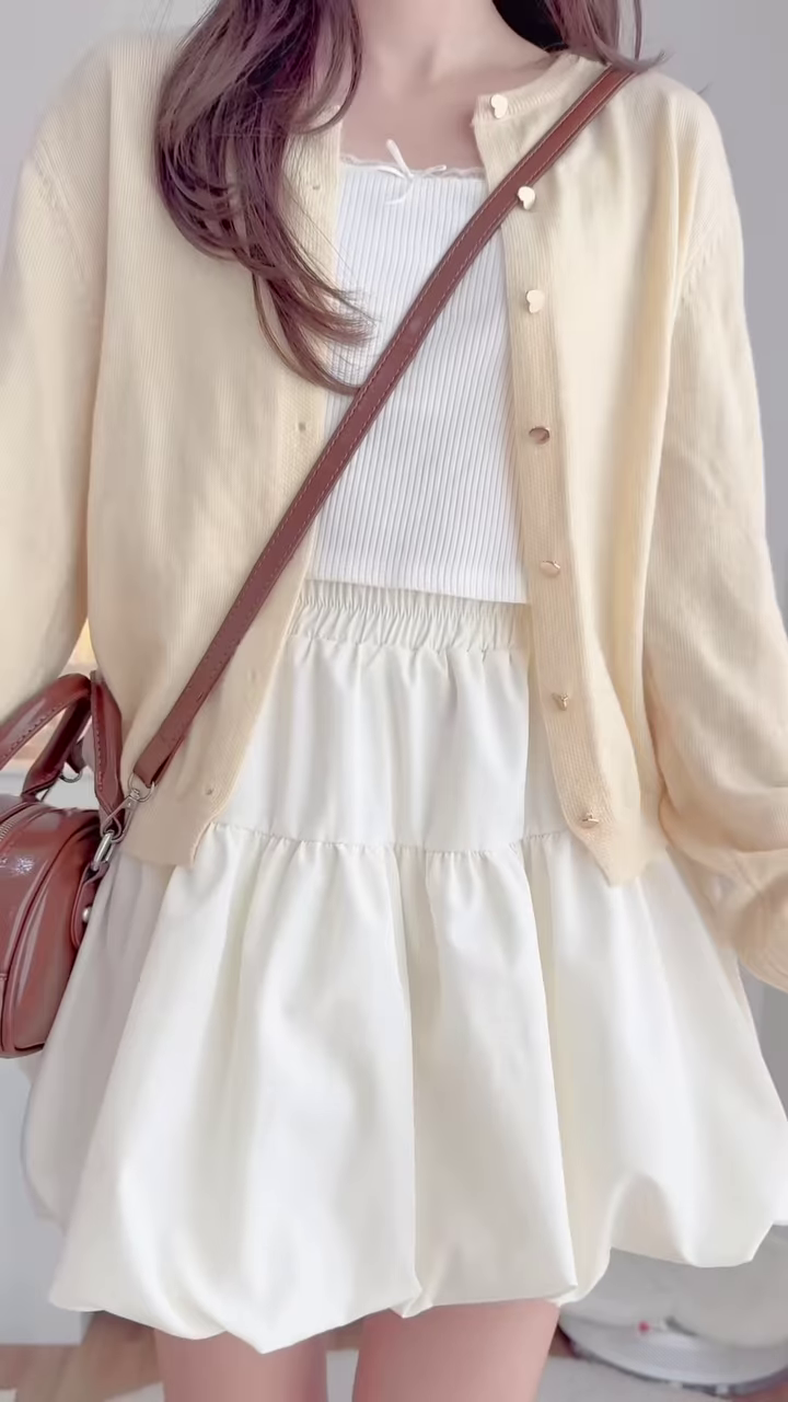 - ๐ฃ Light Purple: Ribbed cardigan with five bow-shaped buttons + embroidered heart with โRโ detail