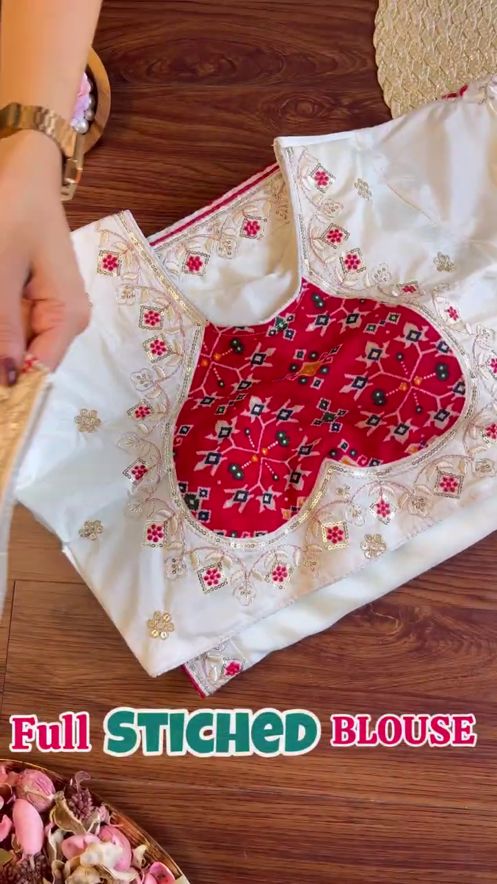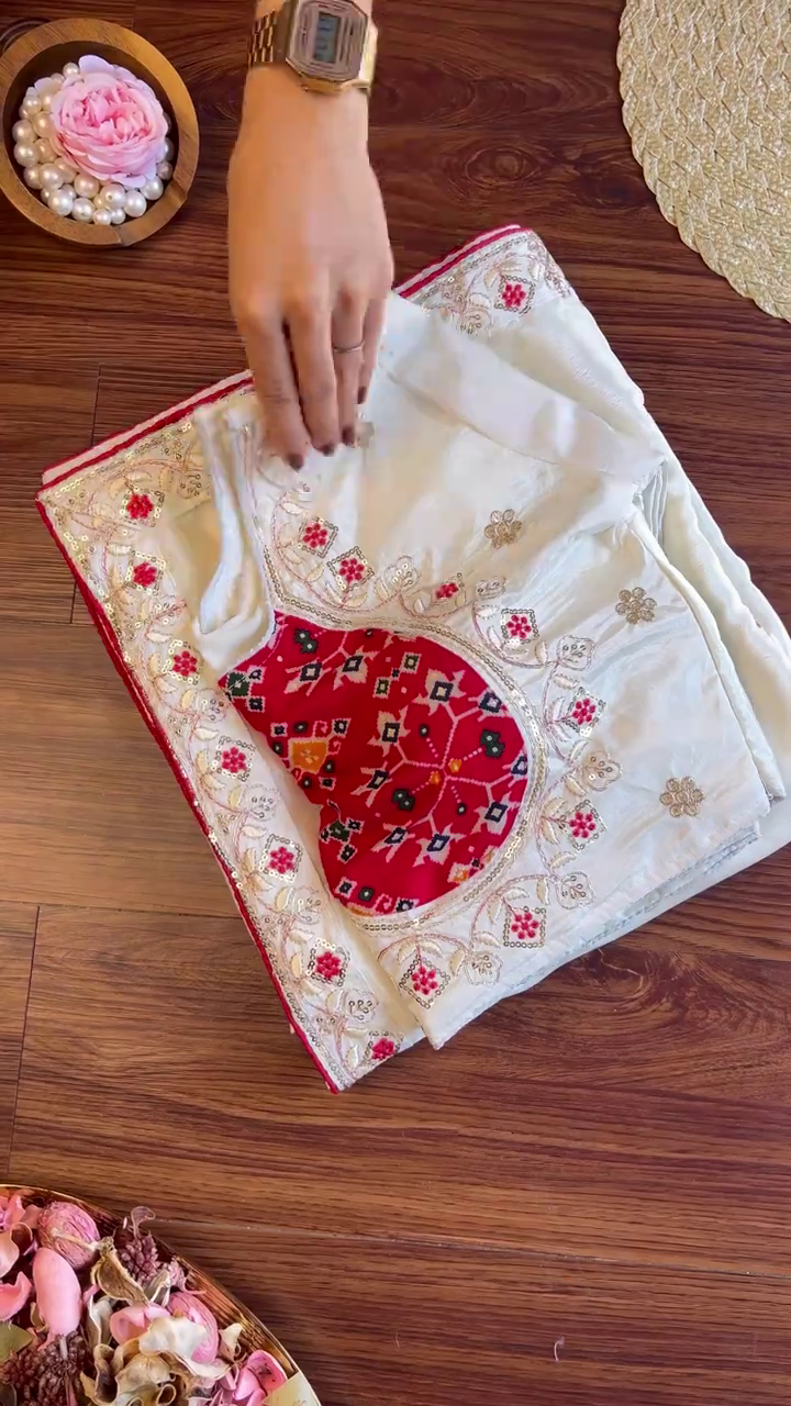Dry Clean Only: Essential to maintain the purity of the white fabric and protect the delicate zari and Patola panel.
