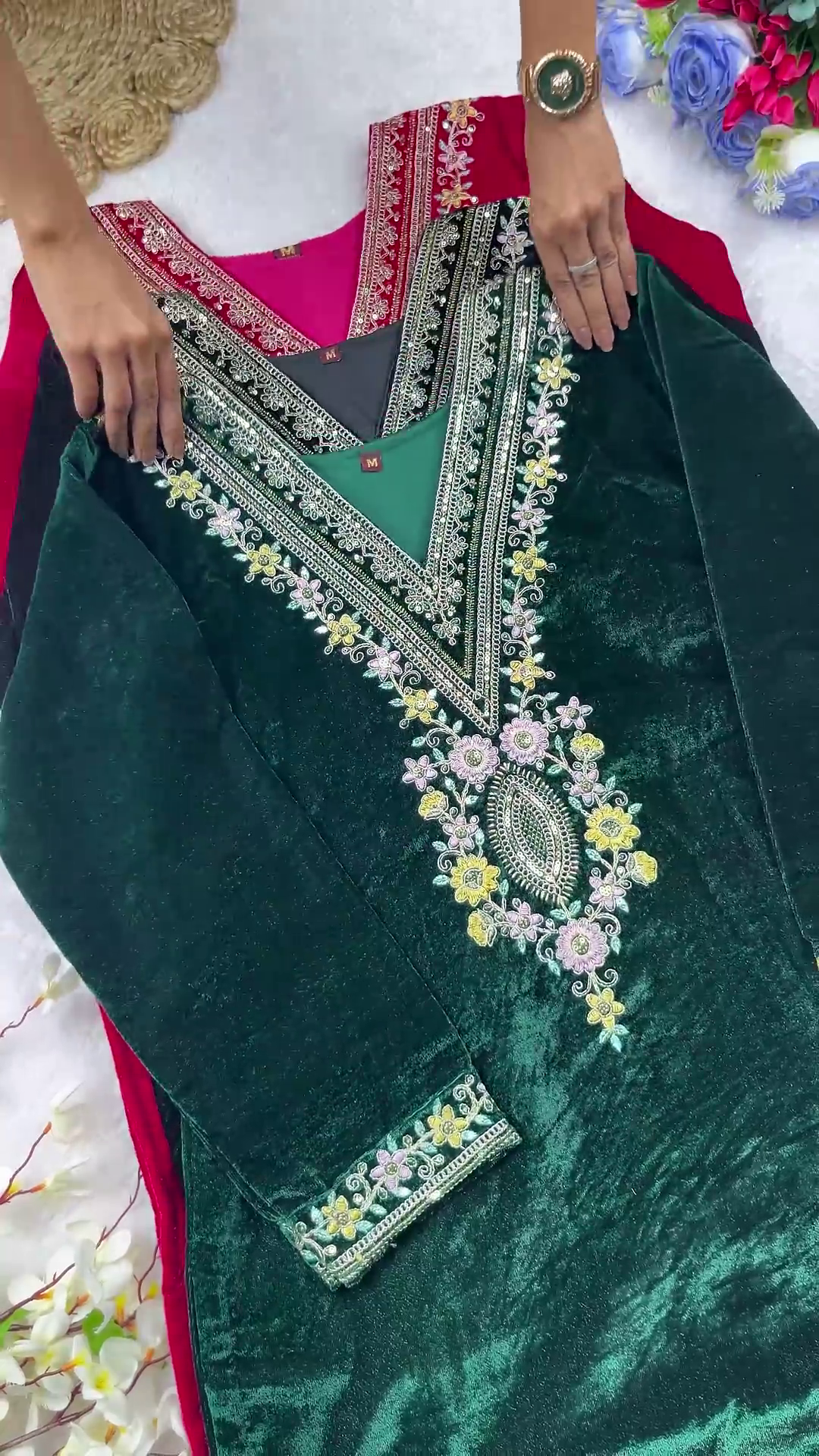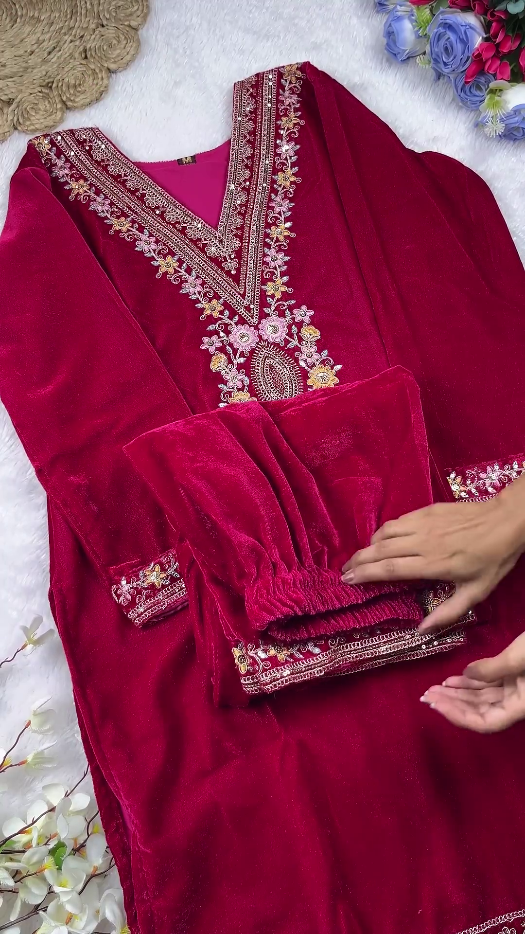 • Matching Velvet Trousers: Paired with coordinated magenta velvet pants featuring an elasticated waistband and matching embroidery at the ankles.