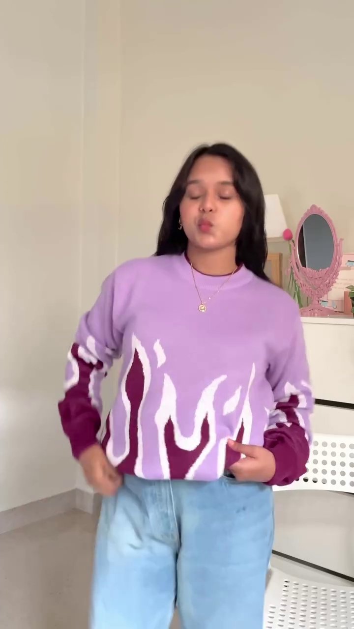 - 🔥 Purple Flame: Purple sweater with white and maroon flame motifs on front and sleeves + light blue jeans