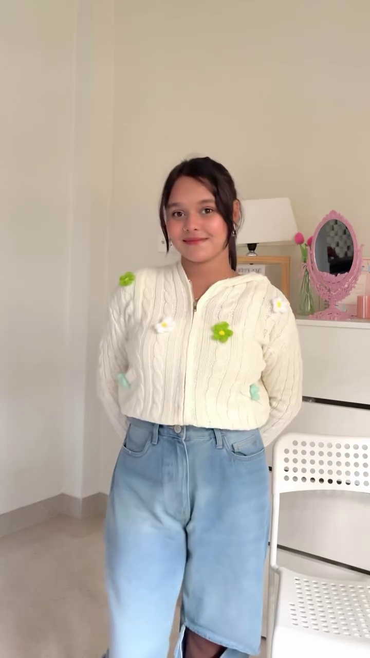 - 🌸 Floral Cardigan: White knitted cardigan with colorful flower embroidery + high-waisted light blue jeans