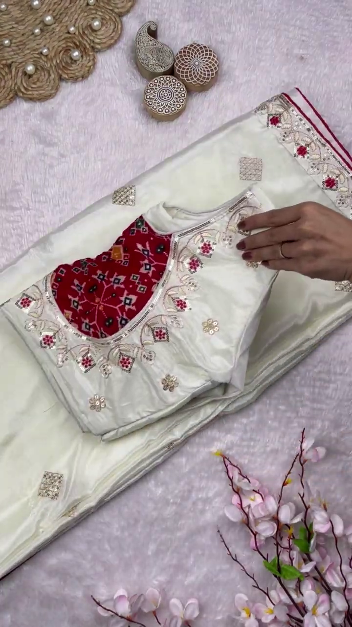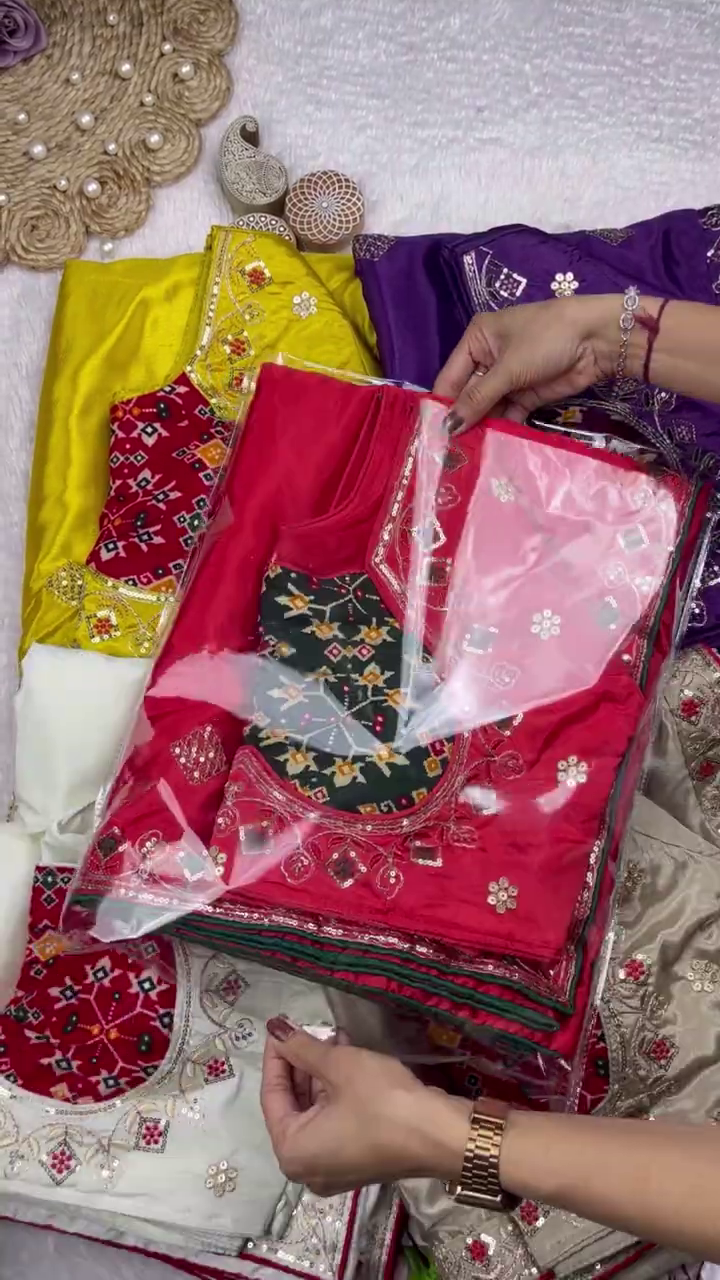 | Work Type | Golden Zari Embroidery • Sequin Floral Buttis • Patola Print |