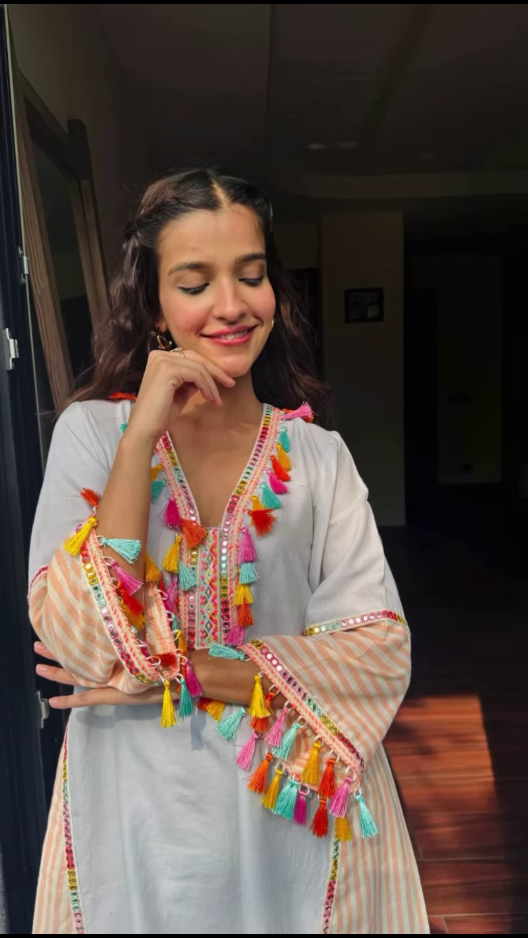The kurti features generous beaded embroidery across the neckline and vertically along the placket—arranged in symmetrical rows that draw the eye without overwhelming the garment’s light tone. What truly sets this piece apart are the white shell accents carefully placed within the beaded designs, adding depth, texture, and a beachy-luxe twist to traditional wear.