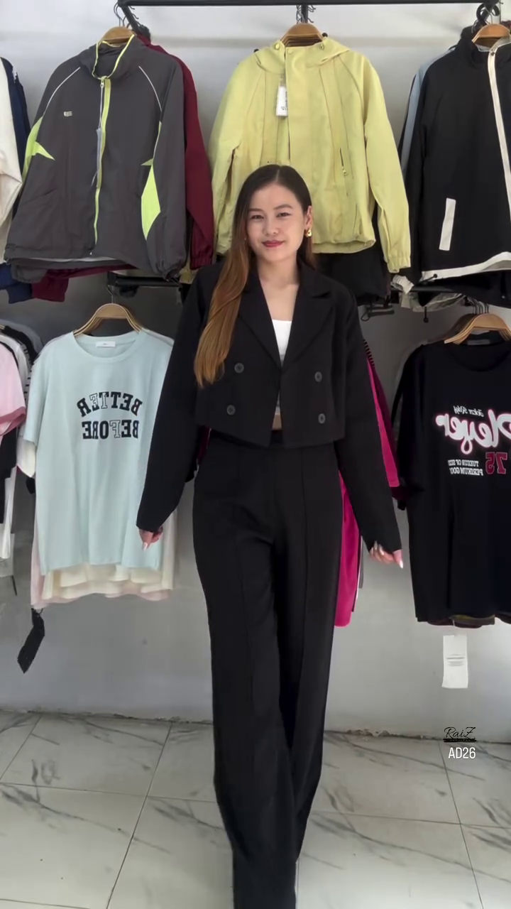 The cropped blazer features a double-breasted design with bold black buttons, creating a striking contrast that adds depth to its crisp white tone. Tailored with a structured cut and sharp lapels, it delivers a polished finish while maintaining a comfortable fit. Its slightly cropped length highlights the waistline, giving it a chic, fashion-forward edge.