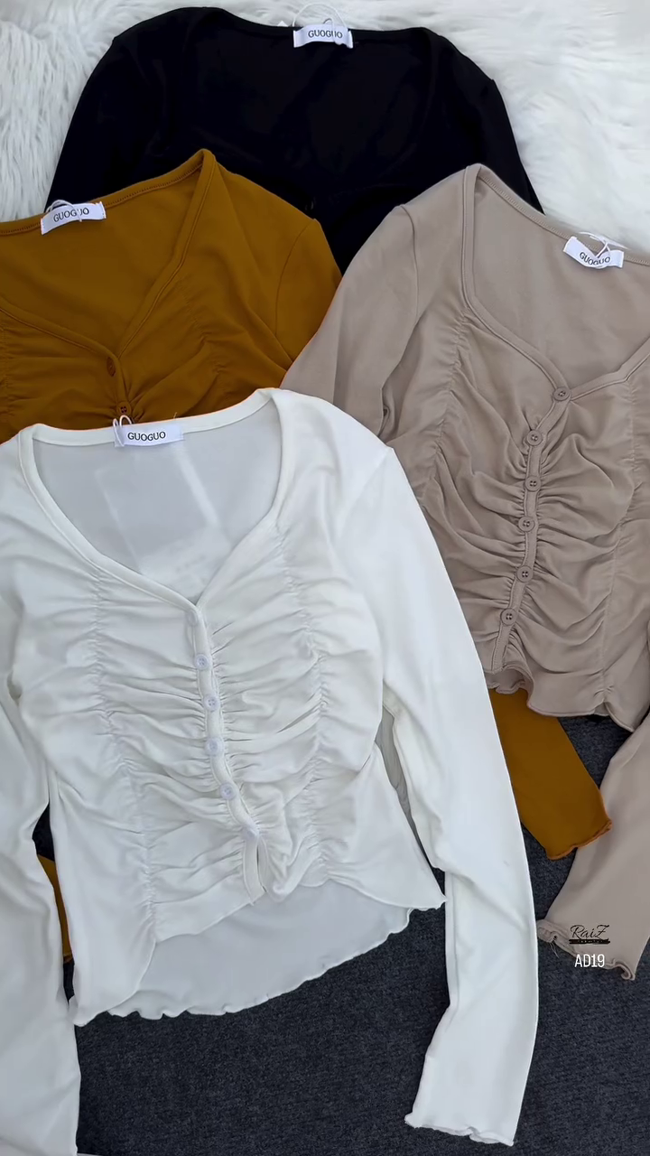 Crafted from a soft, stretchy fabric, the top provides a snug yet comfortable fit that moves with your body. The standout ruched detailing along the front creates a slimming effect, enhancing the natural curves for a feminine and stylish look. Featuring a button-front closure, it offers both functionality and a trendy touch, allowing you to wear it fully closed for a polished look or slightly open for a relaxed vibe. The long sleeves make it ideal for year-round wear, offering just the right amount of coverage while still keeping things lightweight and breathable.
